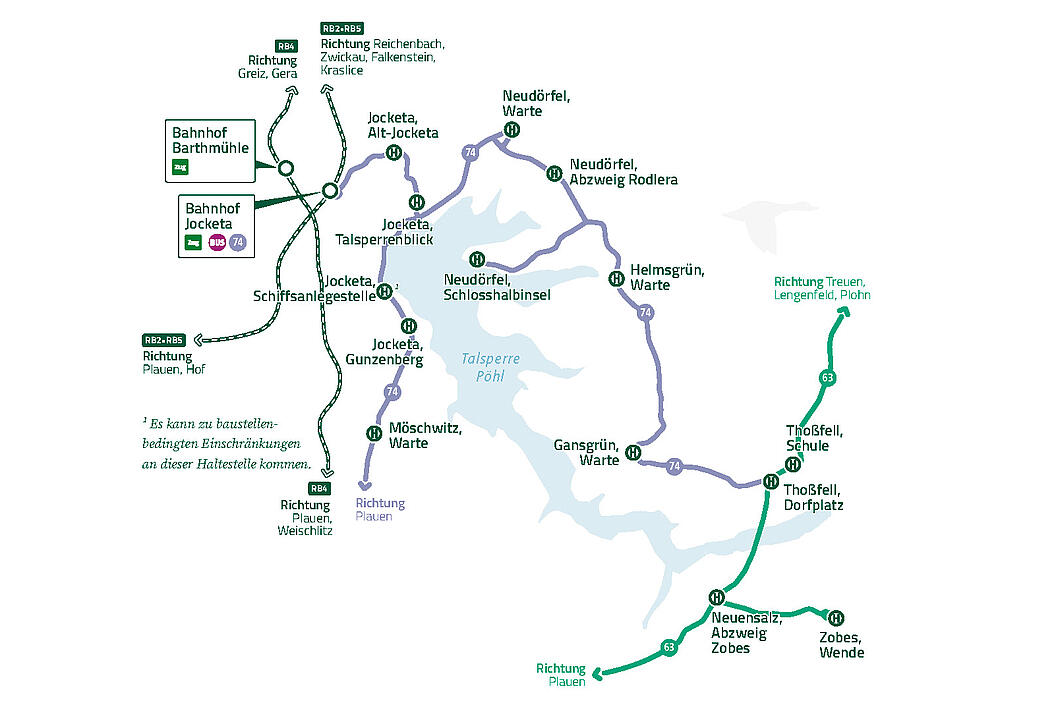 * ab dem 1. September fährt die Linie 74 täglich als RufBus, mit Voranmeldung unter Servicetelefon 03744 19449. Mehr Informationen zu den Saisonzeiten finden Sie in den Fahrplänen der Linie 74. Die Regionalbahnen sowie der TaktBus 63 binden die Pöhl ganzjährig an.