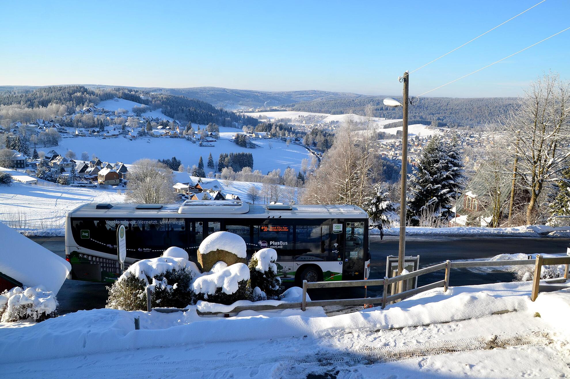 Winterzauber: Die Linie 90 bringt Sie bis auf den Aschberg. Von hier aus können Sie einen atemberaubenden Panoramablick genießen und zur Aschbergalm, nach Mühlleithen oder talabwärts nach Klingenthal wandern.