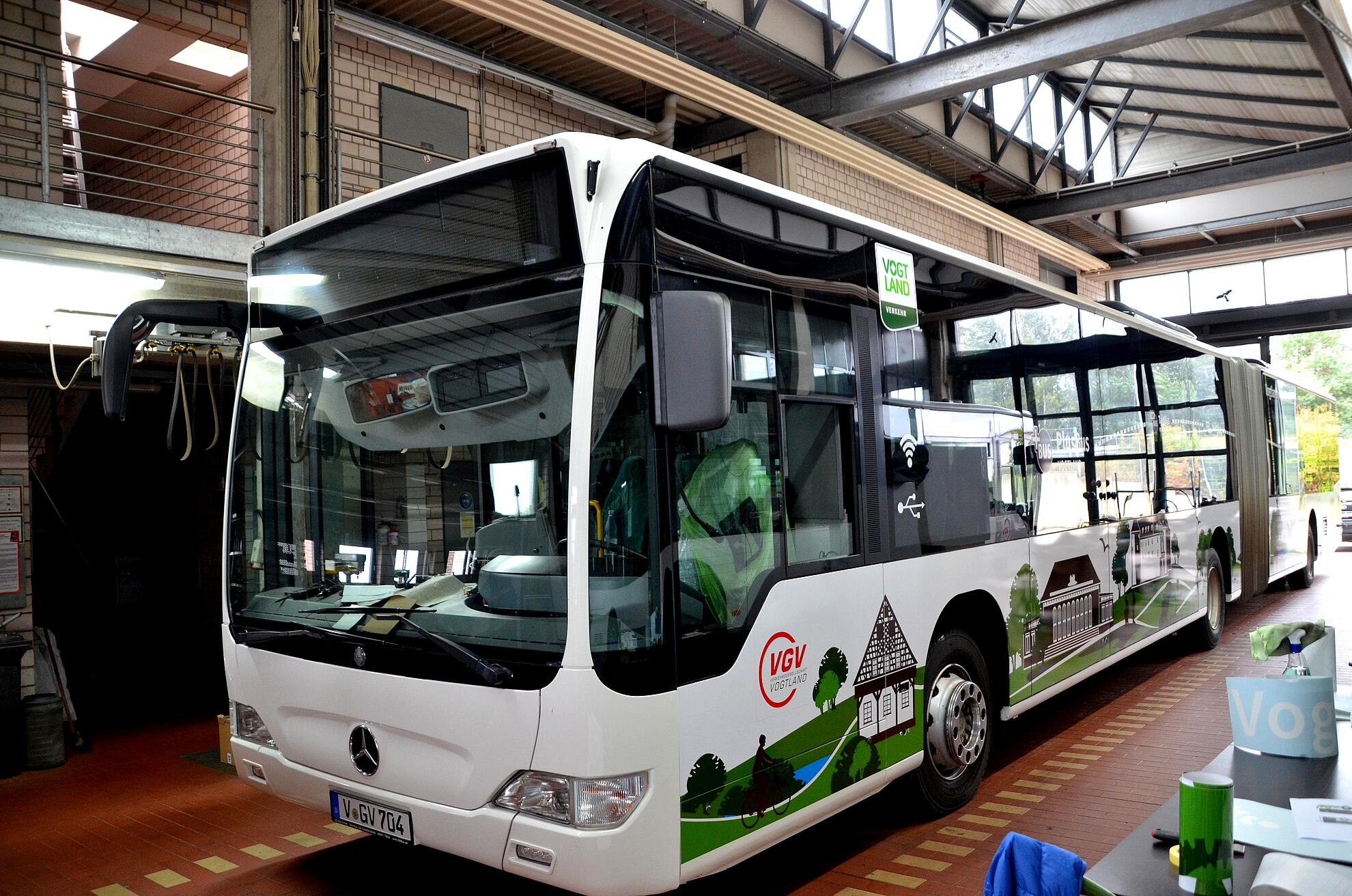 Bildtitel: VGV-Geschäftsführer Thomas Schwui schickt mit Schuljahresbeginn einen Gelenkbus in den PlusBus-Linienverkehr des Göltzschtals. Foto: VVV