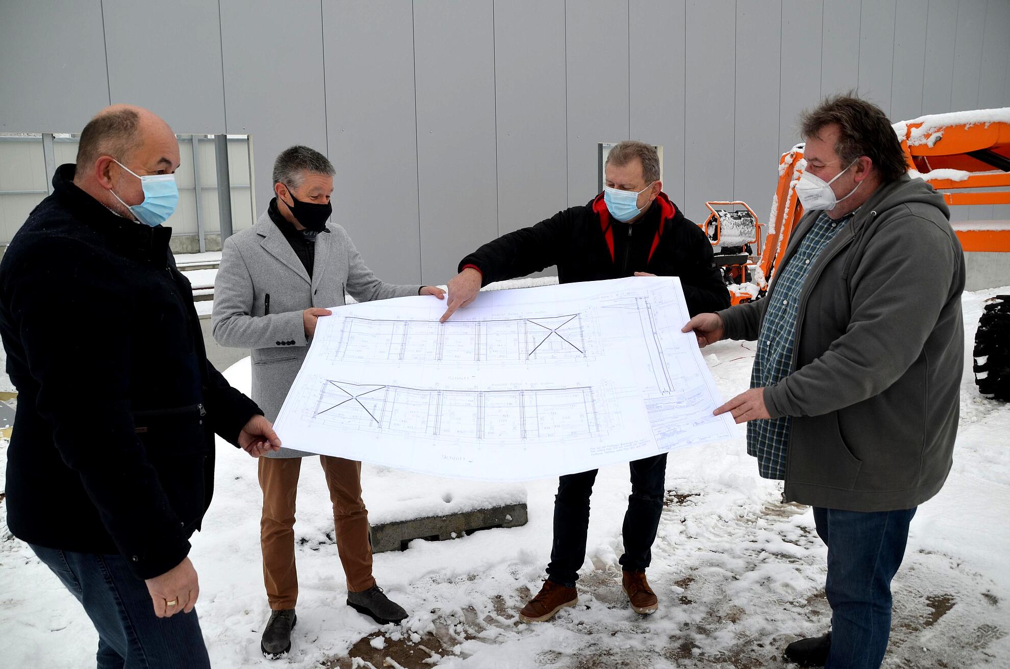 Bildtext: Coronapandemie und Schnee können sie nicht aufhalten. Im Bild von links Investor Gunter Reiher, Architekt Carsten Rahm, Geschäftsführer Rainer Wolf (MW Schlüsselfertigbau GmbH & Co KG) sowie Elektrobauleiter Sven Hager (Elektrotechnik Plauen GmbH) bei einer Baubesprechung. Foto: Karsten Repert Weitere Bilder: Gunter Reiher ist Geschäftsführer der Nutzfahrzeuge-Service Reiher GmbH. Foto: Karsten Repert